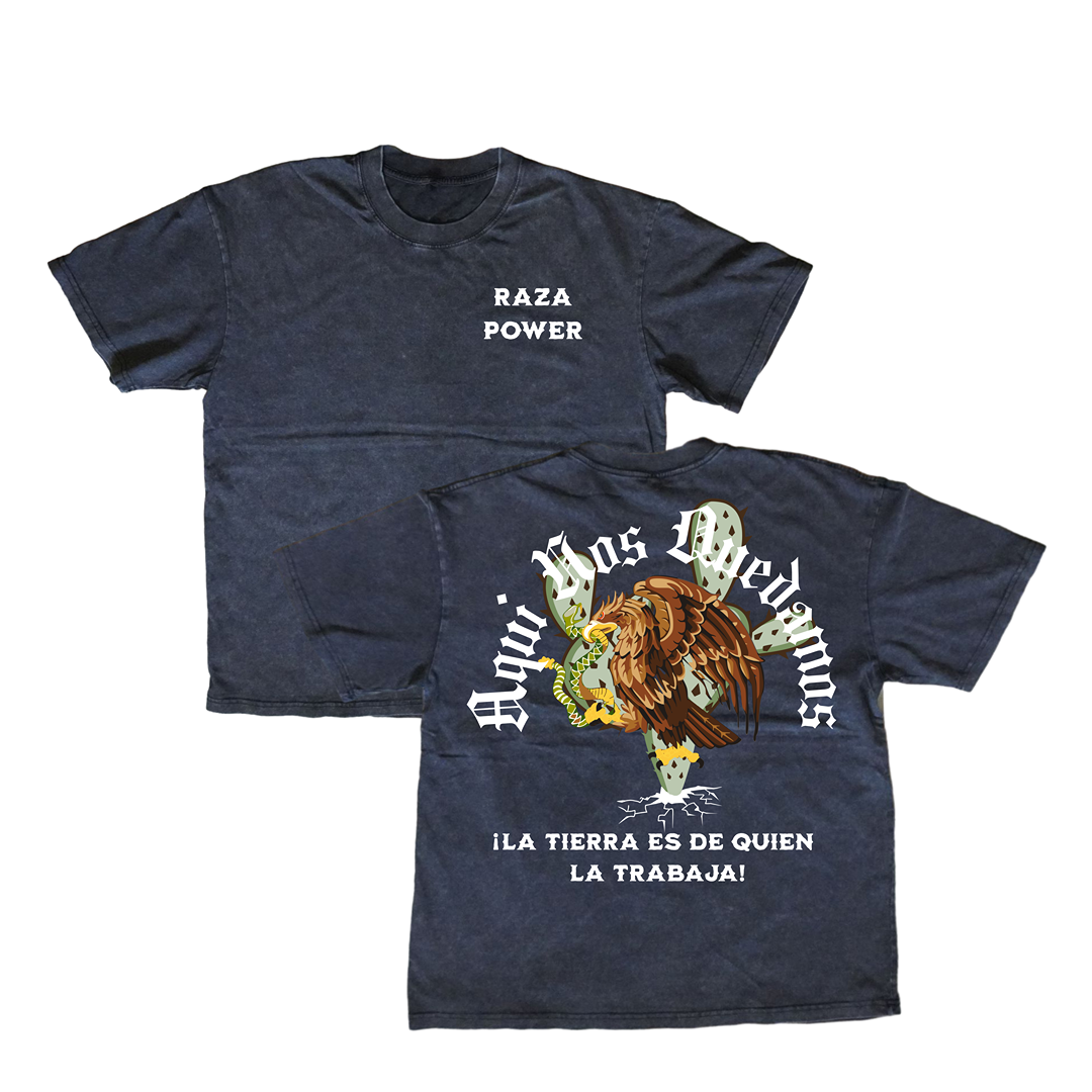 Rooted in resilience, the design features the Mexican eagle and serpent standing proud against the cactus, paired with the bold message “Aquí Nos Quedamos” — a reminder that no matter the fear, no matter the raids, we stand firm, together, in our communities.